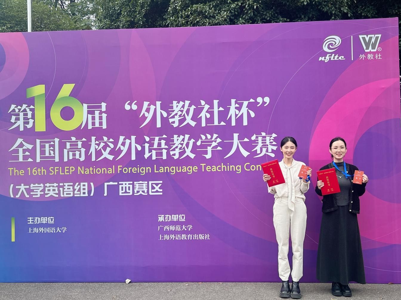近日,第十六届“外教社杯”全国高校外语教学大赛(大学英语组)广西赛区比赛圆满落幕。代表南宁师范大学出战的外国语学院唐艺嘉、钟荛键两位老师凭借出色的教学能力和稳定的现场发挥,分别荣获视听说课组一等奖和综合课组一等奖,展现了我校外语教师扎实的专业素养与教学风采。