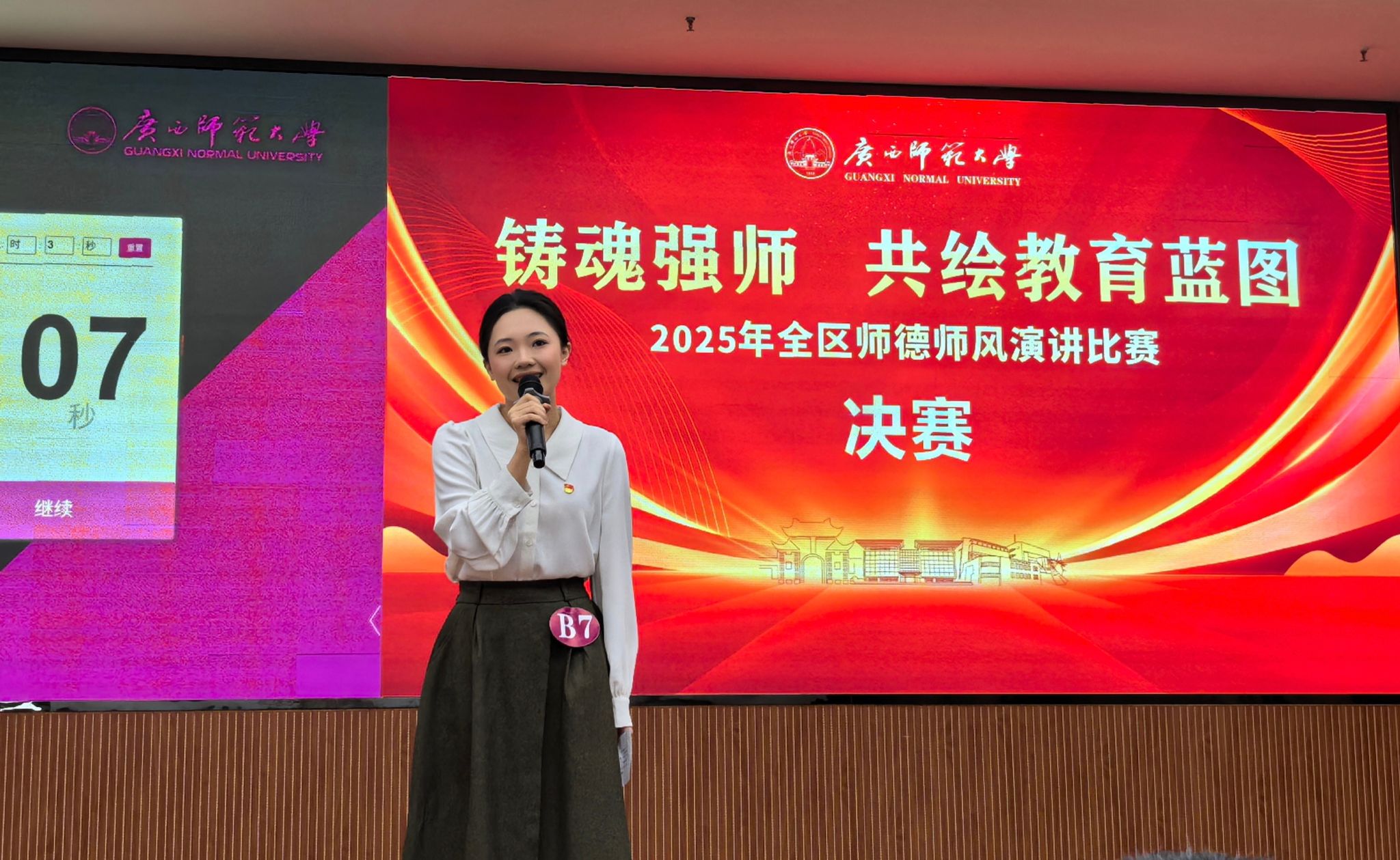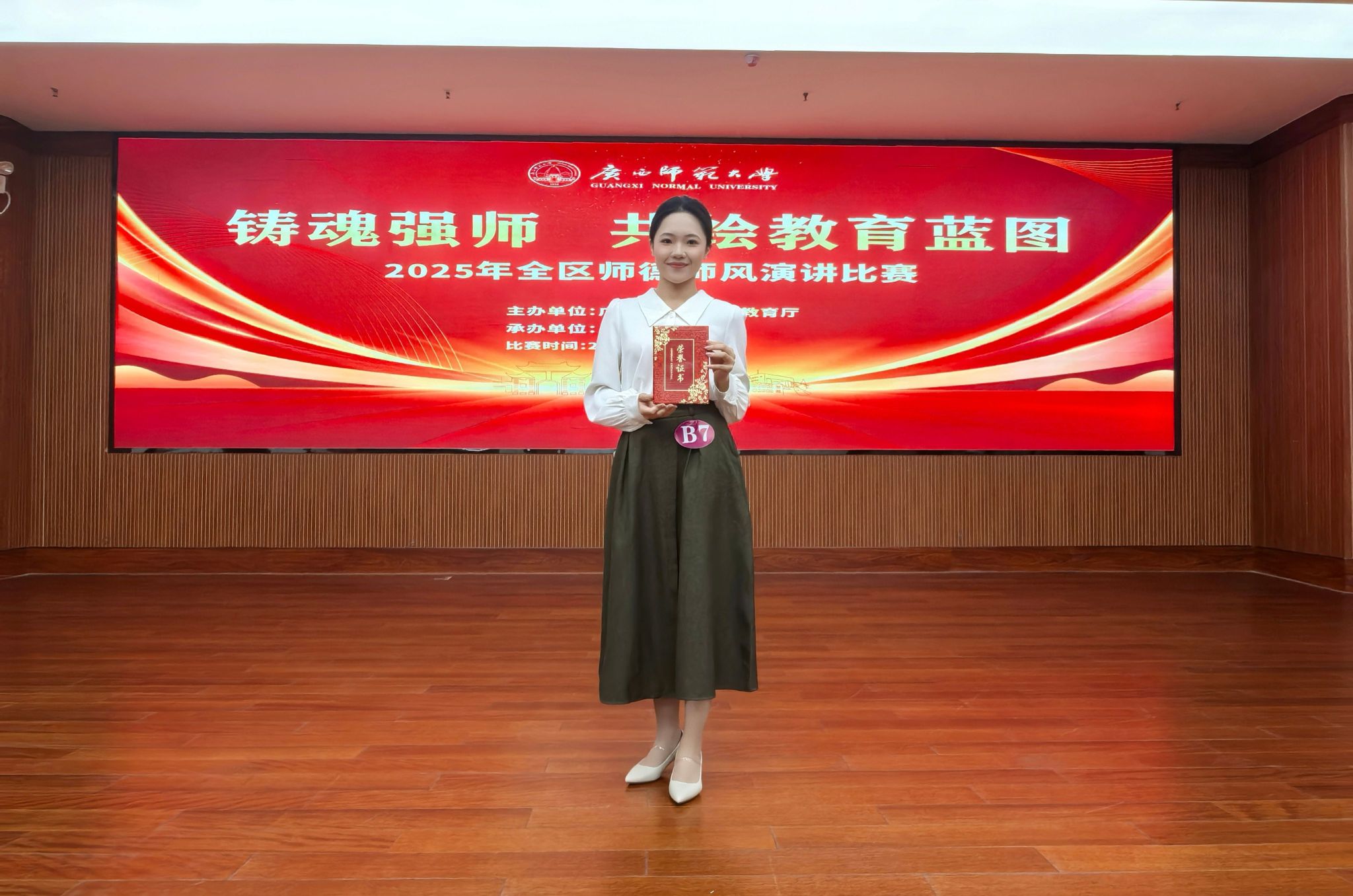 11月8日至9日,由广西壮族自治区教育厅主办的2025年全区师德师风演讲比赛在广西师范大学举行。外国语学院2023级英语专业2班刘静怡同学荣获高校师范生组一等奖,展现了外院学子的卓越风采与扎实素养。