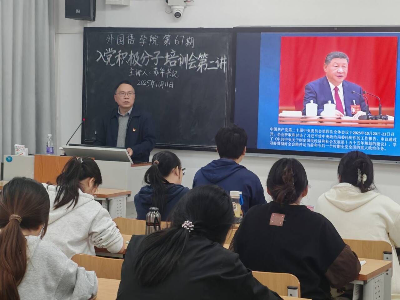 11月11日下午,外国语学院党委在实验楼2B-301举行外国语学院第六十七期入党积极分子培训会第二讲。本次培训会的主题是“弘扬精神谱系,推进强国建设”,由外国语学院党委书记苏华主讲,本学期认定的32名入党积极分子参加此次培训会。