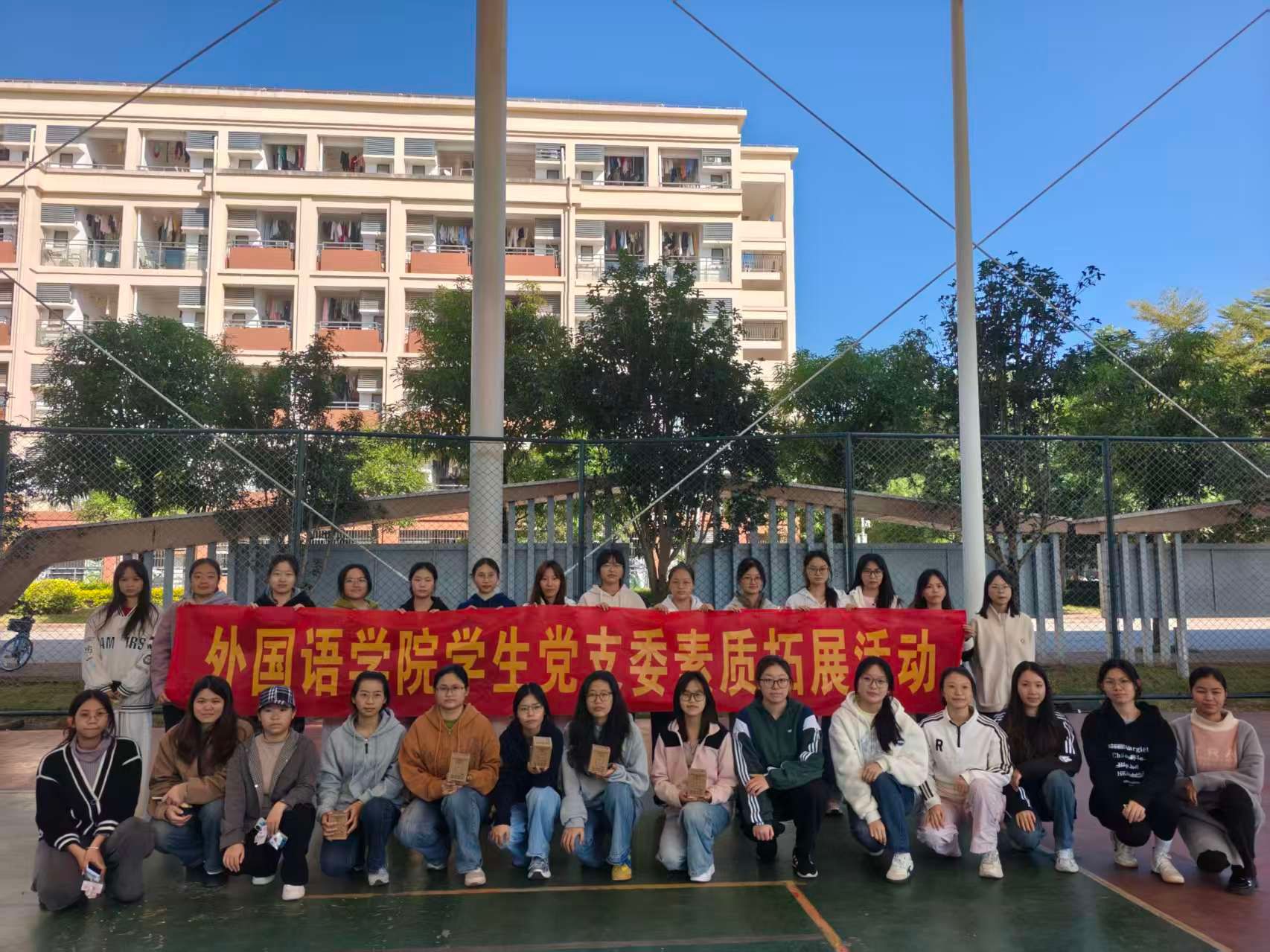 为深入学习贯彻党的二十届四中全会精神,加强学生党建工作队伍建设,11月29日,外国语学院党委在武鸣校区桂园排球场成功举办以“凝聚团队力量,团结担当使命”为主题的学生党支部支委素质拓展活动。学生各党支部全体支委和党务工作助理参加了本次活动。