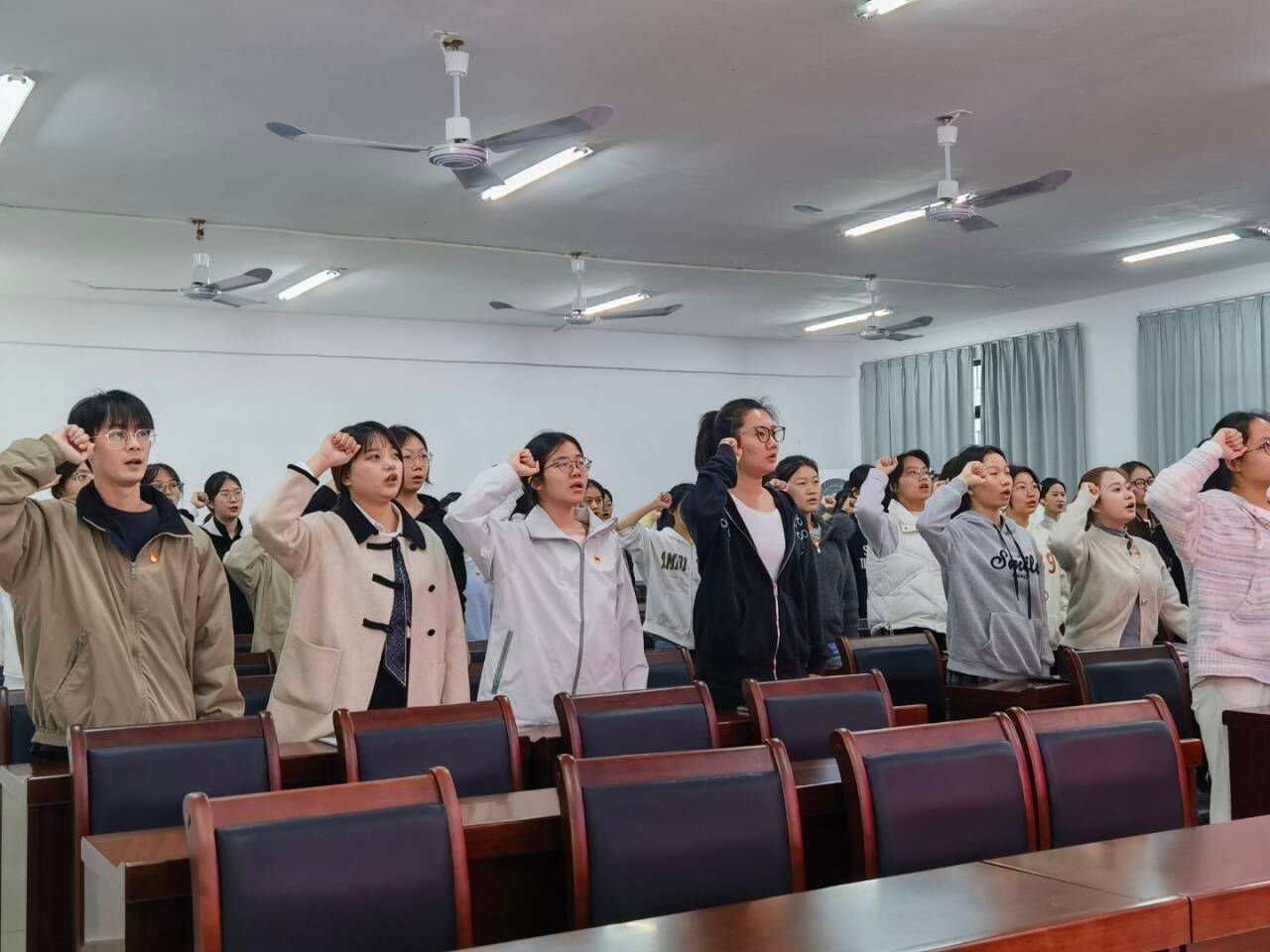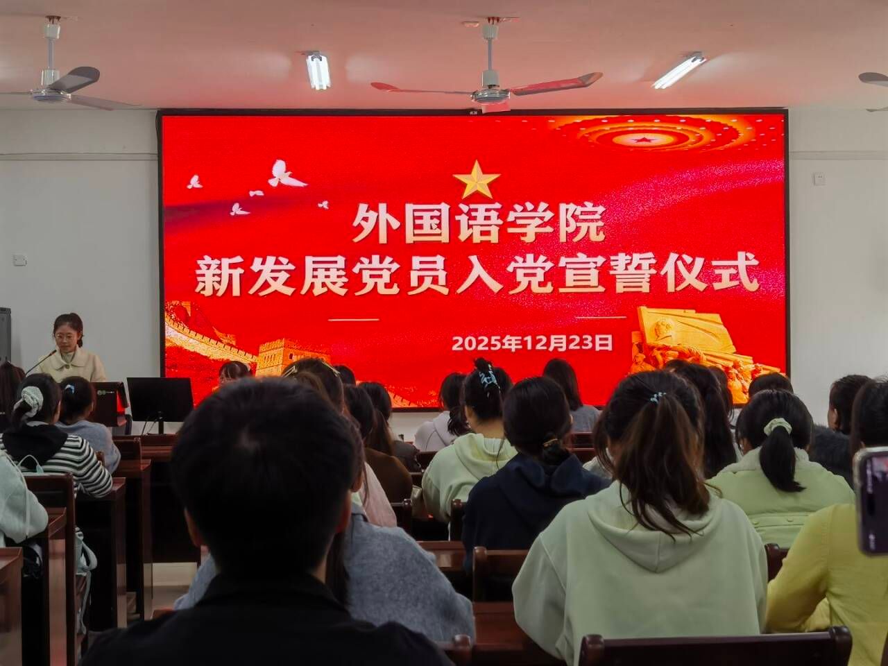 12月23日中午,外国语学院在实验楼1B-515教室举办2025年下半年新发展党员入党宣誓仪式。该仪式共有65名新发展的党员参加。