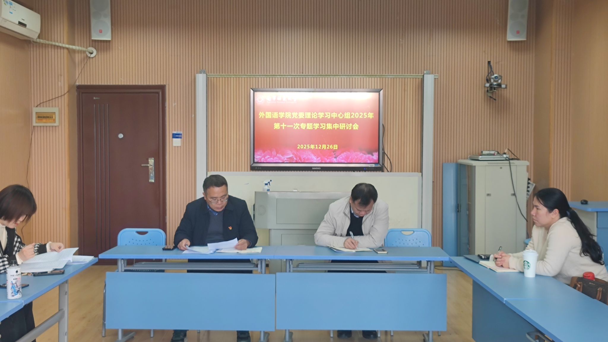 12月26日下午,外国语学院党委理论学习中心组在明秀校区文星楼404教室召开本年度第十一次专题学习集中研讨会。会议由学院党委书记苏华主持,学院党委委员、纪委委员及各党支部书记参会,学院副院长张晓鹏列席会议。