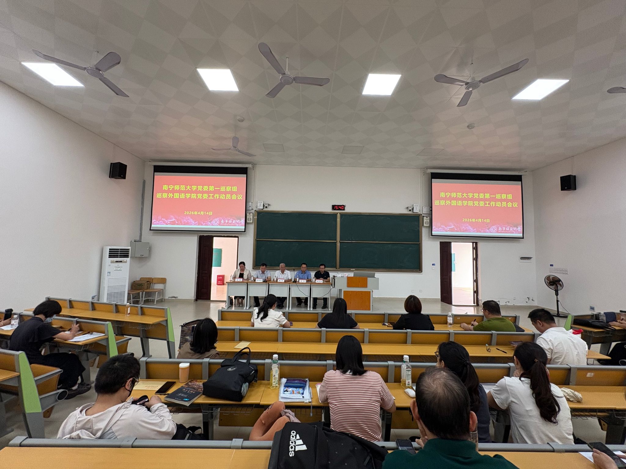 根据学校党委统一部署,4月14日,第一届南宁师范大学党委第一轮巡察第一巡察组巡察外国语学院党委工作动员会议在武鸣校区实验教学楼B113教室召开。第一巡察组组长陆慧作动员讲话,外国语学院党委书记苏华作表态讲话。第一巡察组组长、副组长及全体组员、外国语学院全体教职工和2名学生党员代表参加会议。