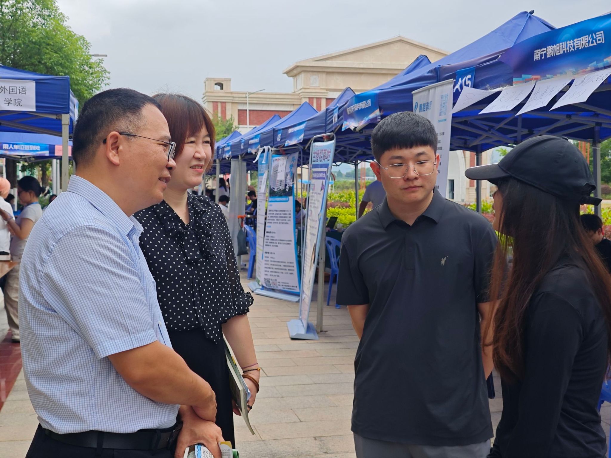 为进一步拓宽毕业生就业渠道,4月27日上午,由外国语学院与体育与健康学院联合主办的“语体同行·职等你来”专场双选会在武鸣校区实验楼1号楼前空地顺利举办。外国语学院党委书记苏华、党委副书记邱晖、学工办各位老师以及来自多个行业的用人单位代表和数名毕业生参加了本次活动。