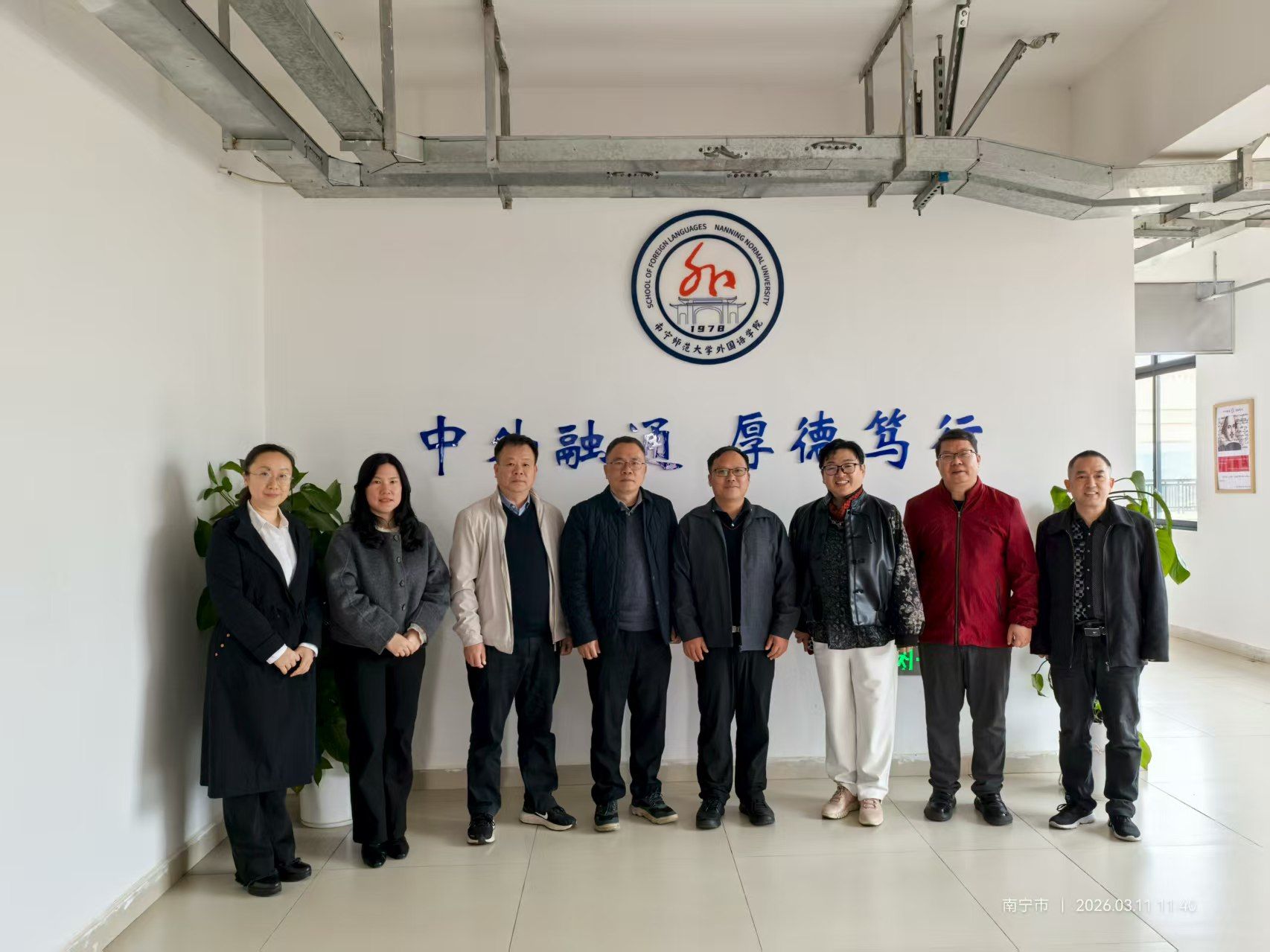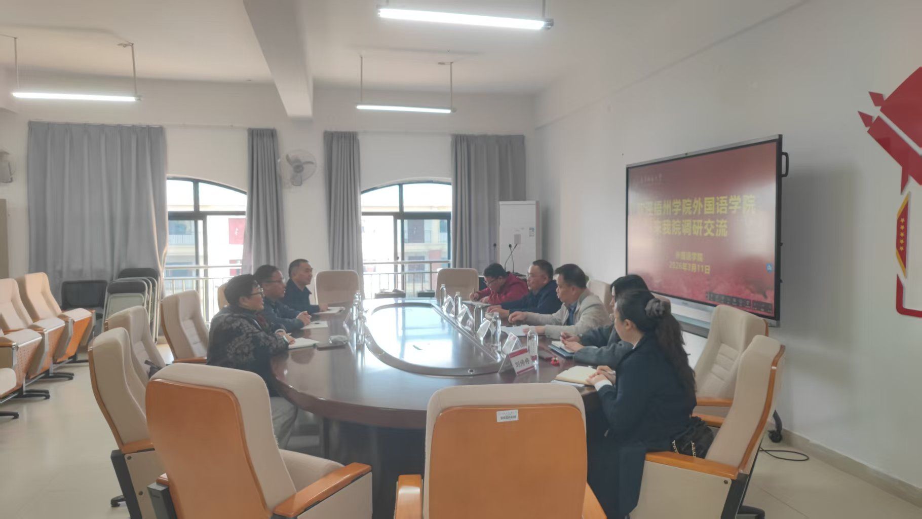 3月11日上午,梧州学院外国语学院党委书记张俊杰、院长宋银秋、副院长晏劲松一行莅临南宁师范大学外国语学院,围绕党建工作、专业建设、学位点培育、科研管理等方面开展专题调研交流。我院党委书记苏华、院长陈光伟、副院长张晓鹏、副院长蒙岚及英语专业负责人刘婷婷与会并热情接待,双方进行了深入座谈交流。
