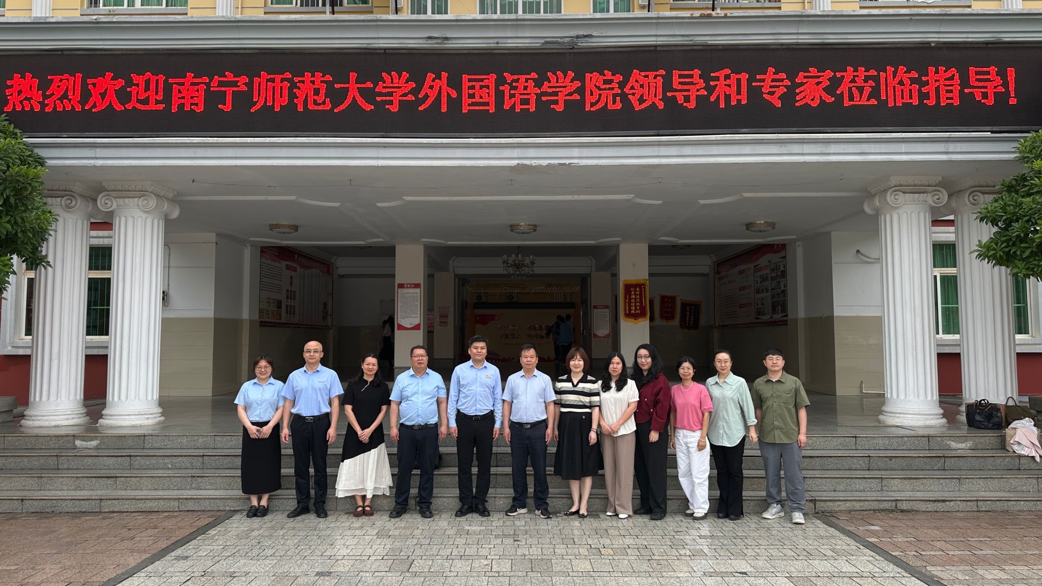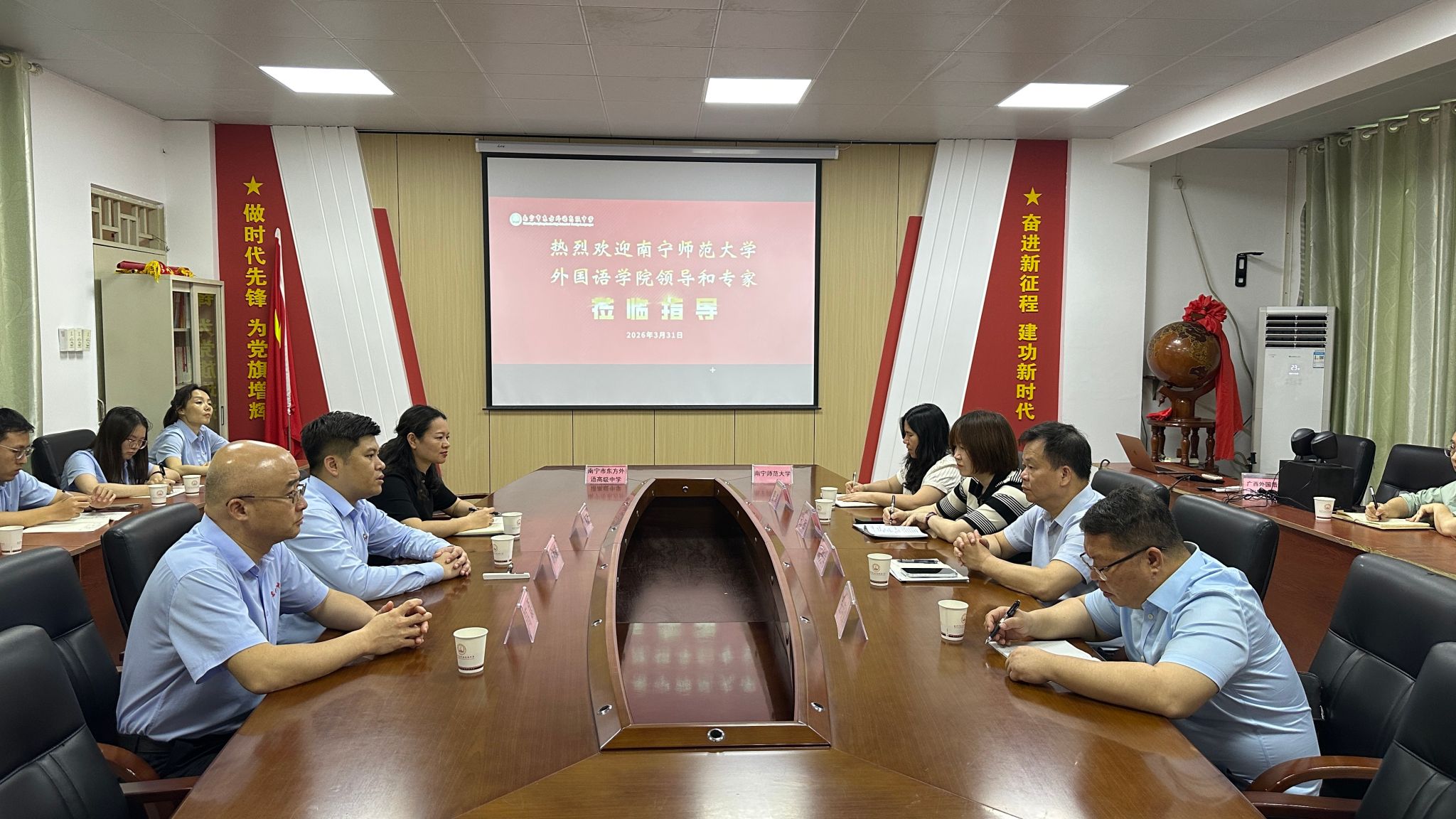 为进一步拓宽毕业生就业渠道,深化校校协同育人与教学合作,精准搭建高校与基础教育优质就业合作平台。3月31日,南宁师范大学外国语学院蒙岚副院长率队,学院陈光伟院长、邱晖副书记、张晓鹏副院长及各教研室主任、毕业年级辅导员一行,前往南宁市东方外国语高中开展访校拓岗合作交流,南宁市东方外国语高中杨祯毅书记、何丽丽校长、高磊执行校长及相关部门负责人热情接待。