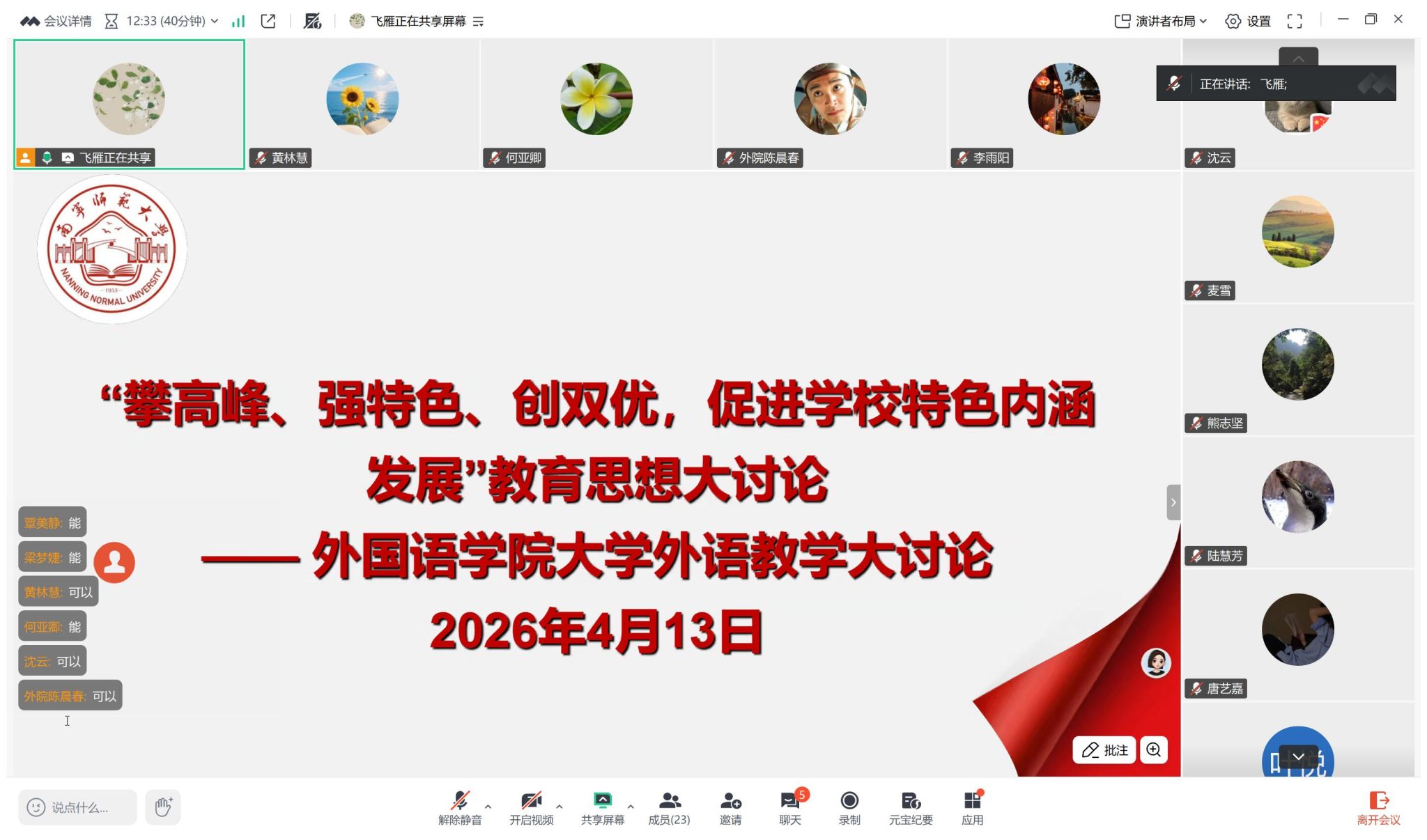 4月13日,外国语学院大学外语教学部以腾讯会议形式,开展“攀高峰、强特色、创双优,促进学校特色内涵发展”教育思想大讨论,扎实落实学校“1395总体发展战略”,推动学院教学高质量发展。