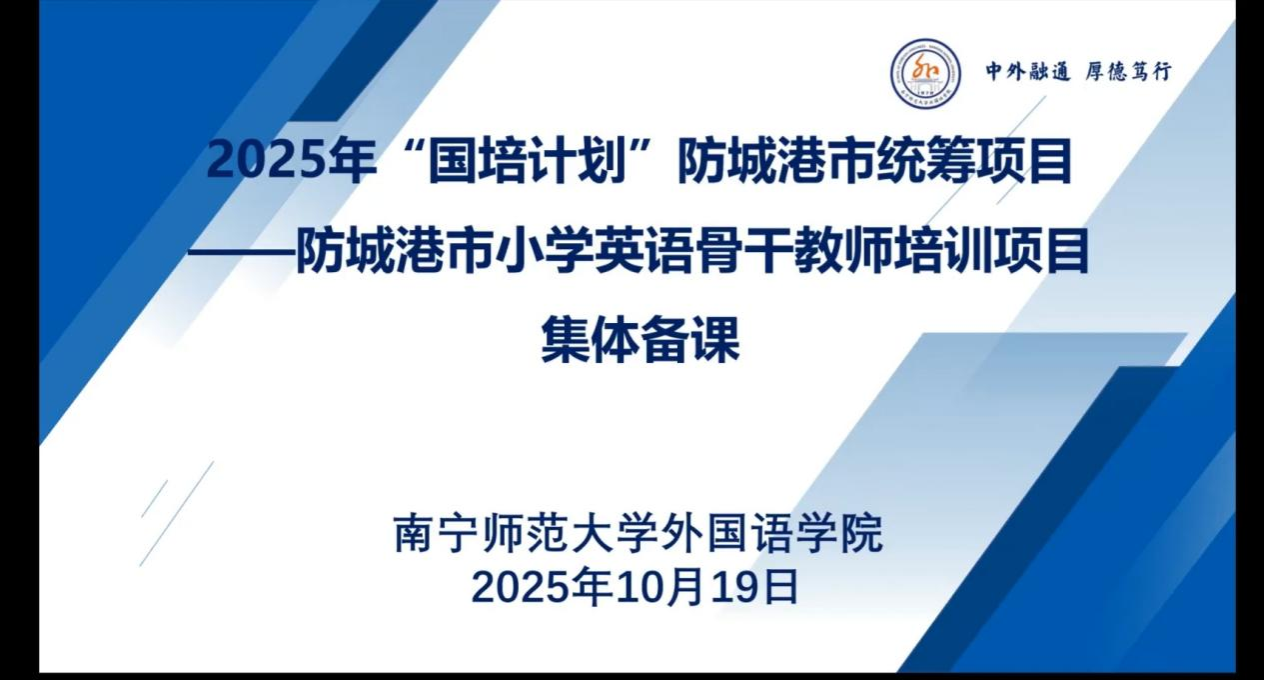 南宁师范大学外国语学院于10月19日上午召开了2025年“国培计划”——防城港市统筹项目小学英语骨干教师培训班线上备课会。会议旨在全面部署培训工作,明确教学任务与要求,为确保该项目的高质量实施奠定坚实基础。南宁师范大学外国语学院院长陈光伟、副院长高飞雁、各课程专家及基地学校负责人共同出席了会议。