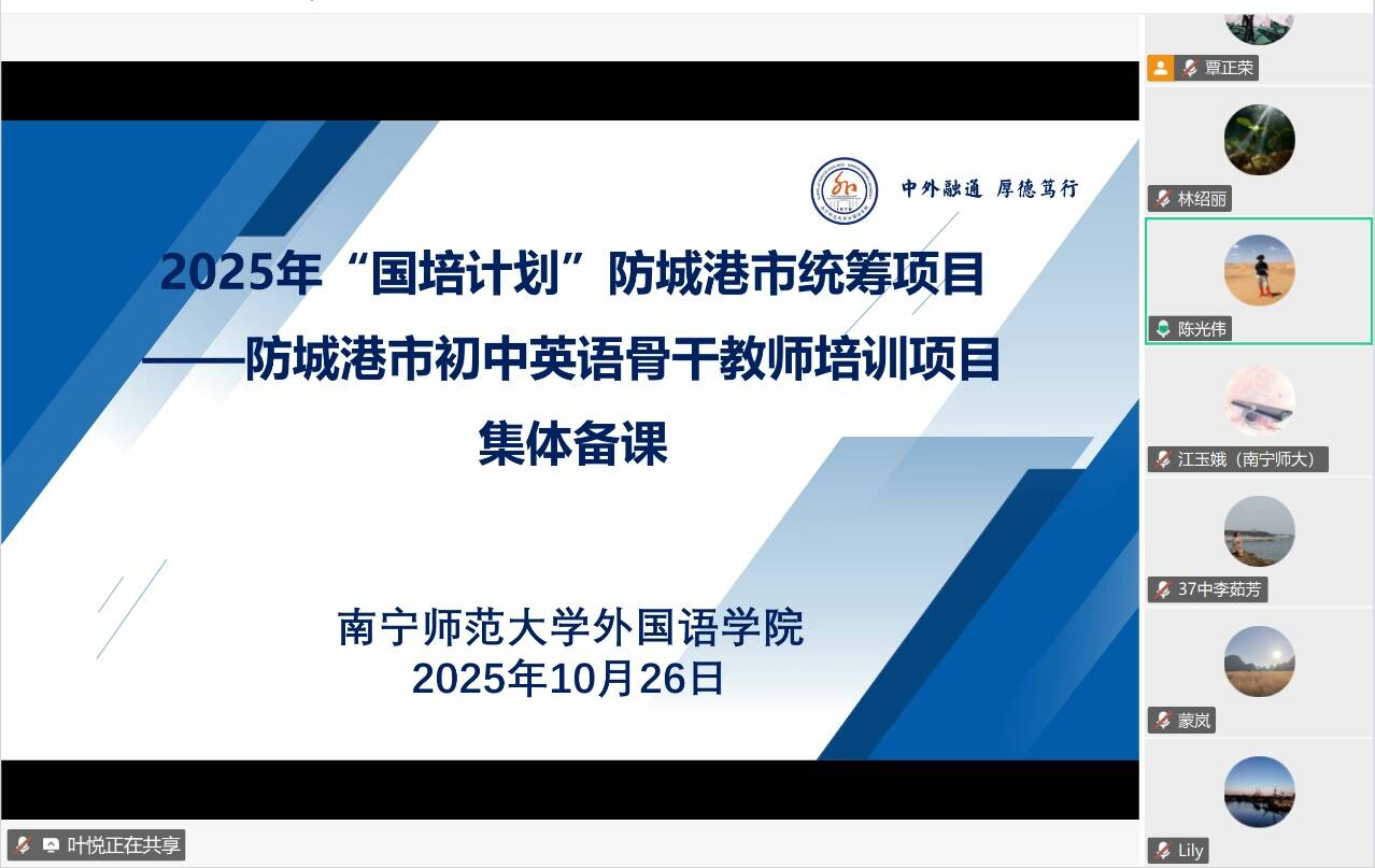 10月26日晚,2025年“国培计划”防城港市统筹初中英语骨干教师培训班集体备课会在线上顺利举行。本次会议由南宁师范大学外国语学院主办,旨在进一步提升防城港市初中英语骨干教师的教学能力与专业发展水平。